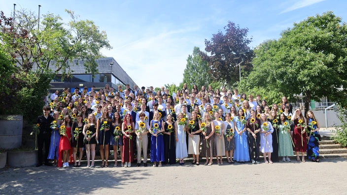 So zeigt dann auch das Foto des Abiturjahrgangs glückliche und dankbare Gesichter - und die vielen Sonnenblumen, die traditionell die Schulzeit am CJD rahmen. Unsere Abiturient:innen haben sie an ihrem ersten Schultag am CJD geschenkt bekommen - nun halten sie sie erneut in Händen.
