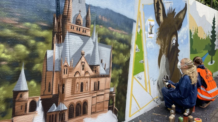 "Ich bin super zufrieden, die machen das echt gut und sind sehr motiviert“, sagt Lena Ortmann. Die Künstlerin leitet das Projekt, bei dem Schülerinnen und Schülern des Gymnasiums und der Realschule zur Zeit der Haltestelle Longenburg ein neues Antlitz geben. Dort, wo zuvor Graffiti-Bemalungen die 200 Quadratmeter-Wand mehr oder weniger verziert haben, entstehen kleine Gemälde rund um das Thema Siebengebirge und CJD. „Die SWB ist der Initiator des Projektes und unsere Schülerinnen und Schüler haben uns Vorschläge mit Motiven eingereicht“, sagt Kunstlehrer Mario Sommer. Gemeinsam mit den Kunstkolleginnen und der Schulleitung haben man eine Auswahl getroffen.