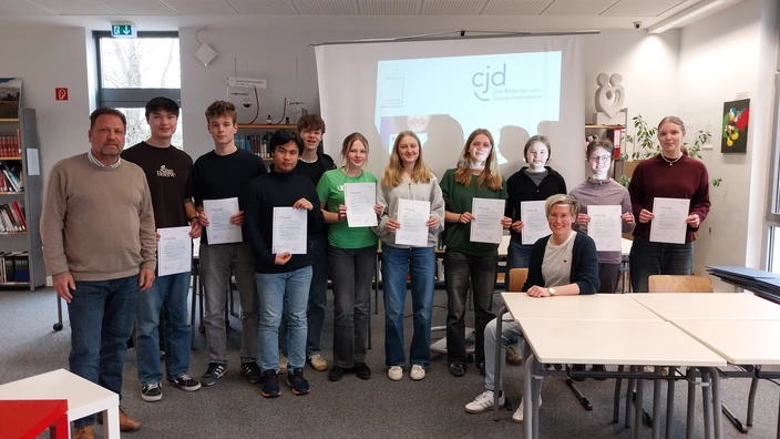Bürgermeister Lutz Wagner hat am 13.3. dem Wahlvorstand der Junior-Bundestagswahl am CJD seinen Dank ausgesprochen und eine entsprechende Urkunde überreicht - eine schöne und wichtige Bestätigung für die Schülerinnen und Schüler, die die Wahl am CJD durchgeführt haben!