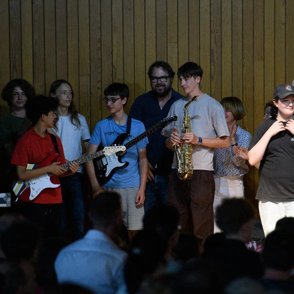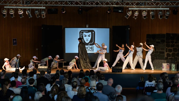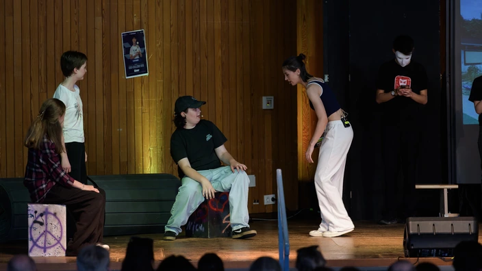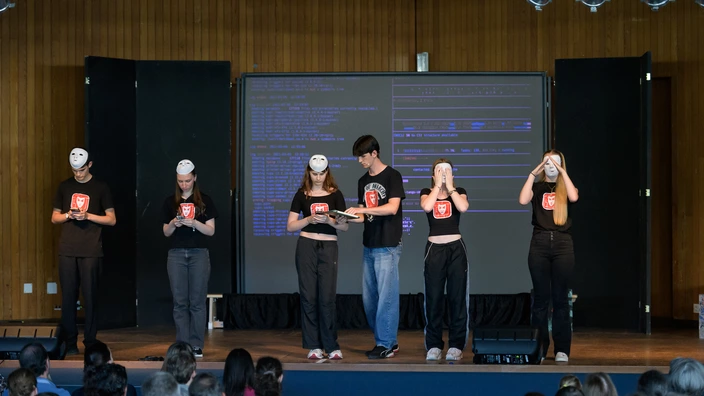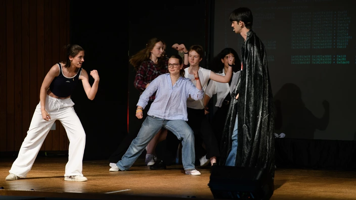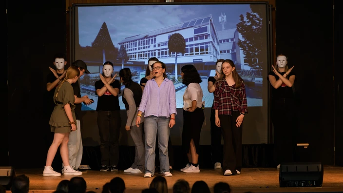 Über 100 Akteure führten in zwei großartigen Vorstellungen das Musical "Code of Change" auf. Die Schülerinnen und Schüler der Musical-AG haben sich mehr als ein Jahr lang auf diese Aufführungen vorbereitet. Die Story wurde weitgehend von den Mitgliedern der AG erdacht und verfasst: Claas, ein ehemaliger Schüler und Informatik-Genie, hat eine App programmiert, die die Nutzerinnen gänzlich in ihren Bann zieht und sie willenlos im Cyberspace einsperrt. Diese Funktion reicht bis in die reale Welt, das Kollegium wird über die Smart-Home-Steuerung der Fenster und Türen der Schule im Konferenzraum eingesperrt. Mit unachtsam veröffentlichten Handyfotos erpresst Claas zudem eine Schülerin, für ihn diese App in der Schule zu verbreiten. Stück für Stück, Nutzer für Nutzer, verwandelt sich die ganze Schule so in einen gespenstischen Raum, das reale, wahre Leben schwindet immer weiter. Die ganze Schule...? Nein, eine kleine Gruppe von Schüler:innen nimmt die Veränderungen in ihrer Schule wahr und kämpft gegen den Algorithmus an. Schließlich gelingt es Ihnen, mit einem eigenen Algorithmus die App zu hacken, Claas zu besiegen und die ganze Schulgemeinschaft aus der App-Welt und dem Bann des Algorithmus zu befreien. Das reale Leben kehrt in die Schule zurück.