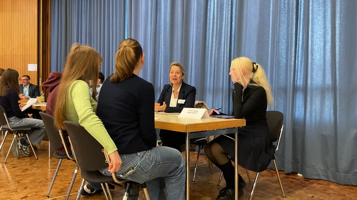 Fragen wie diese durften Schüler:innen der 10. Und 11. Klassen auch in diesem Jahr wieder beim Speed-Debating in der Aula des Schulzentrums Oberpleis an Expert:innen aus Politik, Verwaltung und Wirtschaft richten. Drei Stunden diskutierten die knapp 50 Schüler:innen der umliegenden Realschulen und Gymnasien, meist in Zweiergruppen, mit den knapp 20 Expert:innen, wobei sie alle vier Minuten in einem vorgegebenen Rhythmus von Tisch zu Tisch wechselten.