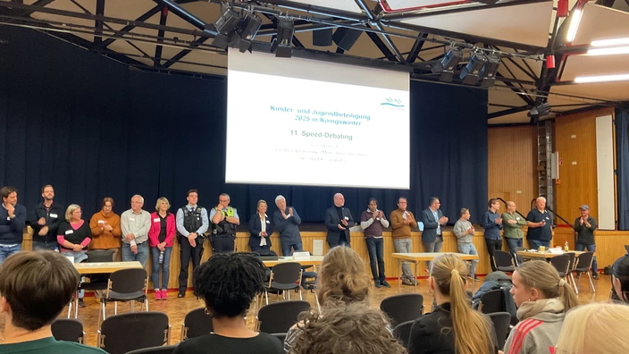 Dass ein Diskussionsformat wie das Speed-Debating, bei dem es um den sachlichen Austausch in möglichst kurzer Zeit geht, erfolgreich sein kann, zeigte nicht nur die positive Reaktion der Schülerschaft. Auch die Vertreter:innen aus Verwaltung, Politik, Vereinen und Medien konnten eine ganze Menge für ihre tägliche Arbeit in den Ausschüssen, Redaktionen und Vereinen mitnehmen. So zum Beispiel, dass vor allem im Bereich der Öffentlichkeitsarbeit in sozialen Netzwerken mehr Informationen bereitgestellt werden sollten. Neben dem Wunsch nach weiteren ,,Mitwirkungsmöglichkeiten“ für Jugendliche in Königswinter wurden auch konstruktive Vorschläge an die Rhein-Sieg-Verkehrsgesellschaft gerichtet, was die Pünktlichkeit und auch die Belegung der einzelnen Buslinien betrifft. Beeindruckt zeigten sich auch die Sportvereine, dass sich einige Jugendliche ganz konkret nach ihren Freizeitangeboten und Tätigkeitsfeldern erkundigten. Die frisch gewählte Bürgermeisterin Heike Jüngling wurde vor allem auf ihre erste Arbeitswoche und ihre Ziele für die Stadt angesprochen. Sie lud am Ende dazu ein, sich in den öffentlich zugänglichen Ratssitzungen selbst ein Bild von der Arbeit des Stadtrats und seinen Ausschüssen zu machen.