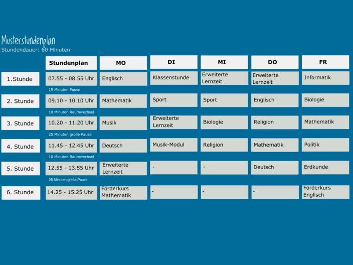 Pausenzeiten sind wichtig für Erholung, Aktivität und den Raumwechsel. Zwischen den Stunden sind mindestens 10 Minuten Pausen. Der Wechsel zum Raum der Lehrkraft der nächsten Stunde (Lehrerräume statt Klassenräumen) gelingt so ohne Hektik.