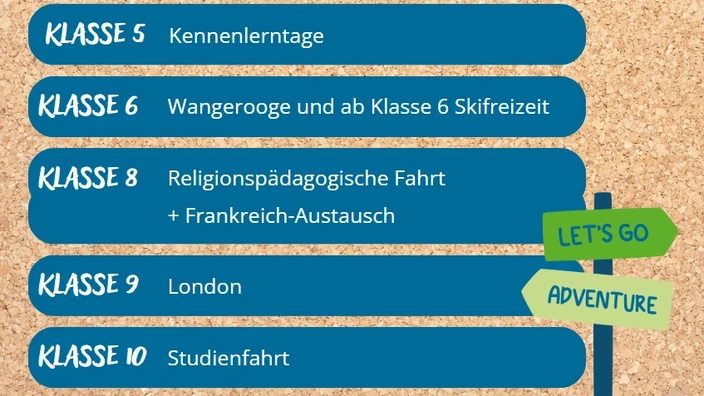 In der Klasse 10 wird eine Studienfahrt durchgeführt. Das Ziel und die Inhalte werden gemäß unserer Kernkompetenzen (musische Bildung, politische Bildung, sportliche Bildung, religionspädagogische Bildung) ausgewählt.